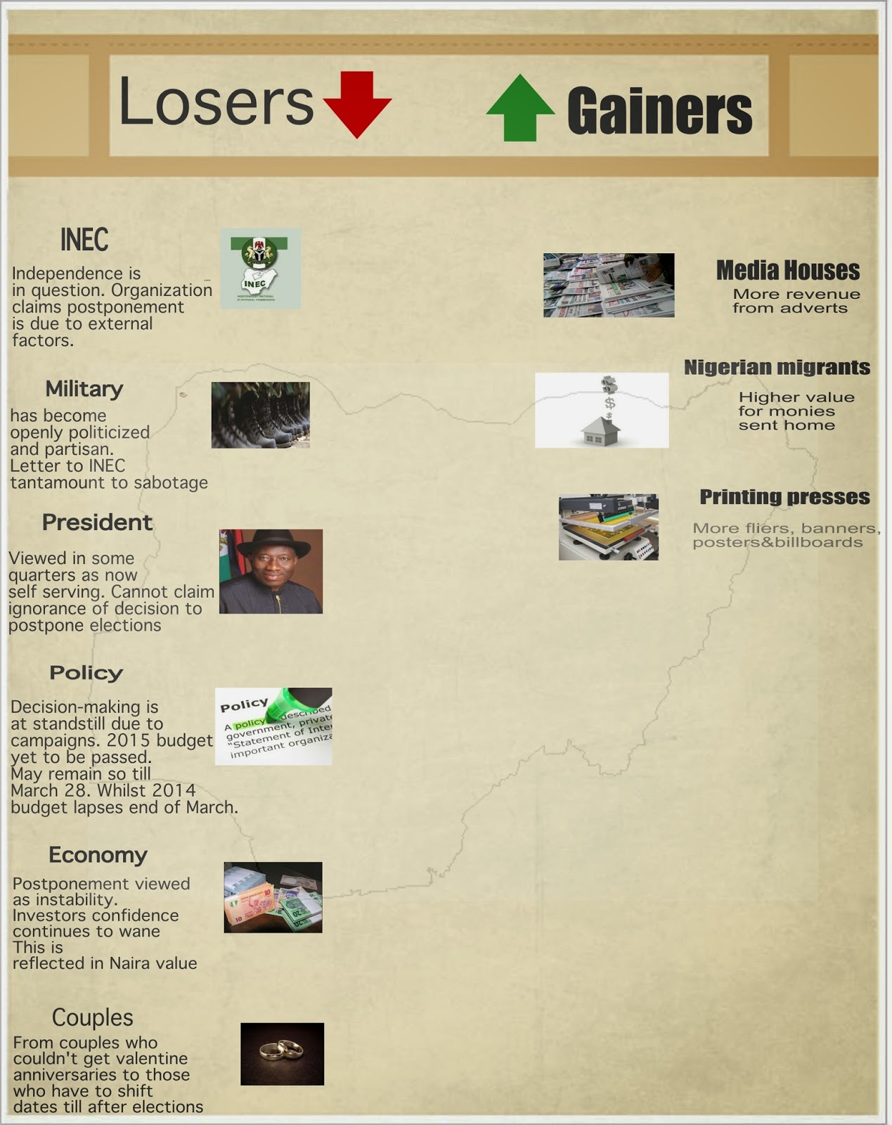 Had the presidential elections held on the 14 of February, Nigerians would have known the captain of her ship till 2019. To be clear, it is within INEC's right to postpone elections within set time frames (Part IV, Section 26). However, this postponement rankles because the Commission categorically stated that it was ready to go ahead with the elections but the nation's security forces openly stated that they will not provide support for elections on the 14th after the National Security Adviser (NSA) had called for a postponement. Who benefits and who loses? At face value, PDP and it supporters through various campaigns benefit as they gain more time to contain the momentum APC had on its side. But did they really benefit? Since the postponement, Boko Haram- that the Military wants to contain in 6 weeks- has attacked several villages, the Naira has further lost its value and investors are bidding their time till after the elections hold. Who loses and who gains?